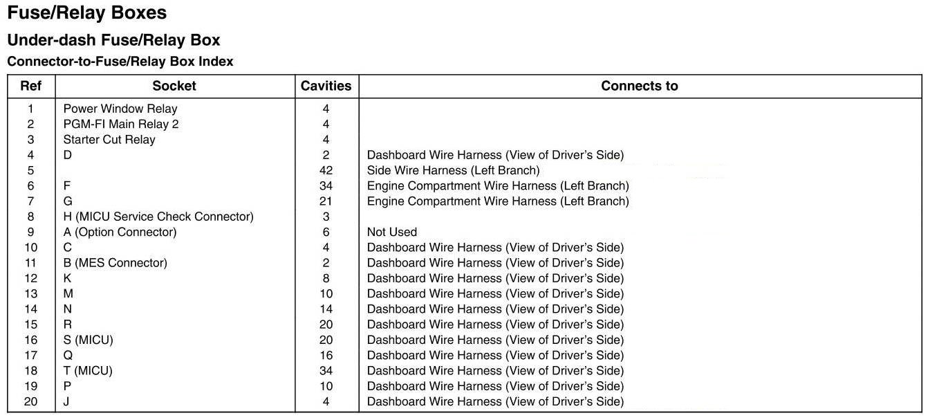 Under-dash Fuse/Relay Box - Connector-to-Fuse/Relay Box Index