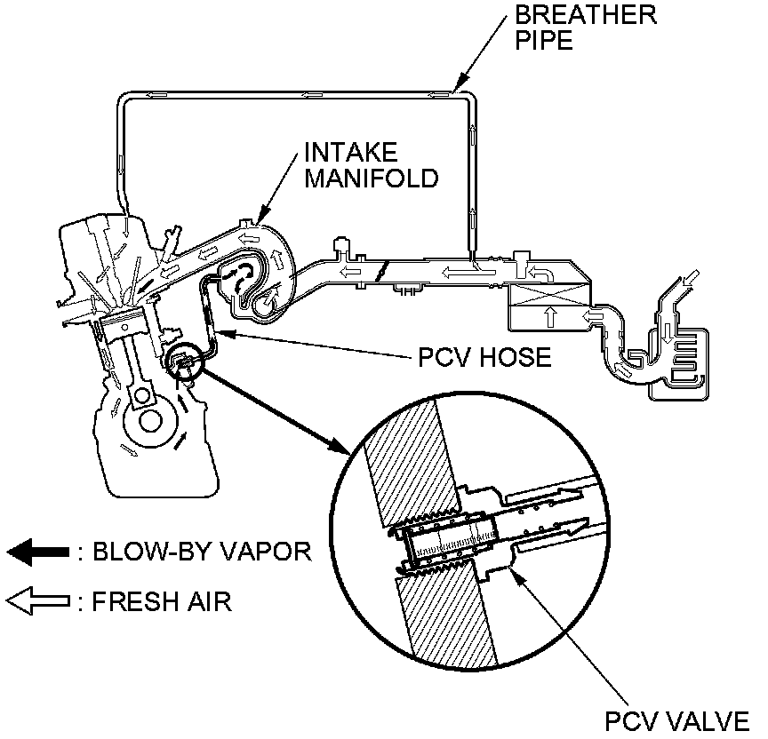 The PCV valve prevents blow-by gasses from escaping into the atmosphere by venting them into the intake manifold.
