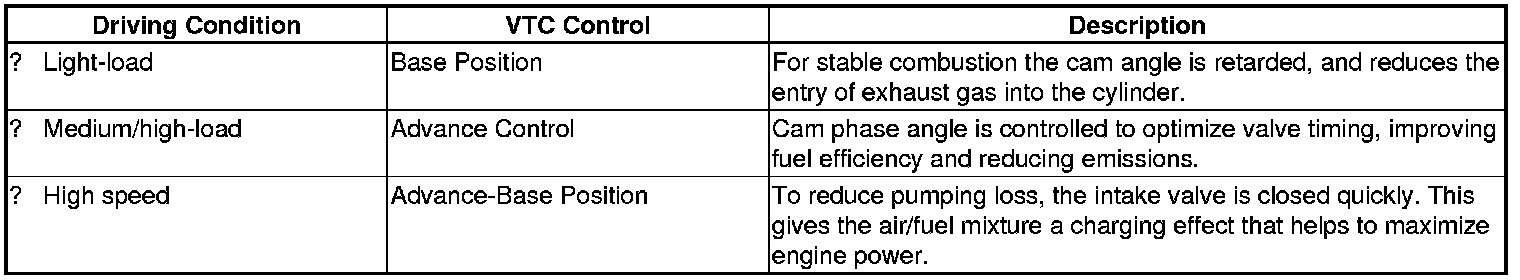 - The VTC system makes continuous intake valve timing changes based on operating conditions.
