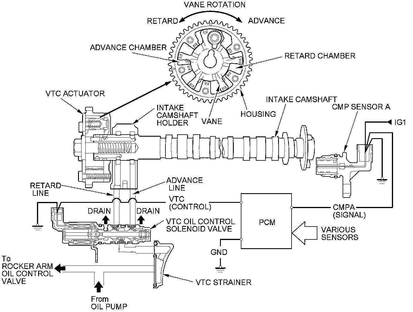 CMP sensor A detects the intake camshaft angle and sends the information to the PCM. The PCM controls the VTC oil control solenoid valve as the intake camshaft angle changes.