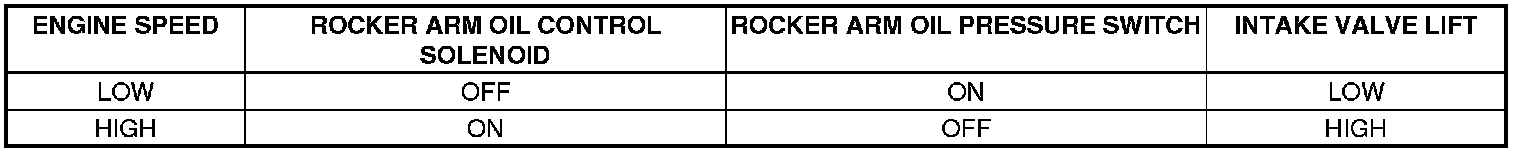 At low engine speed, the rocker arm oil control solenoid is turned off by the PCM. Oil pressure from the rocker arm oil control valve does not enter the intake rocker shaft. Each intake rocker arm is separated by a return spring and lifted by each low lift cam lobe.