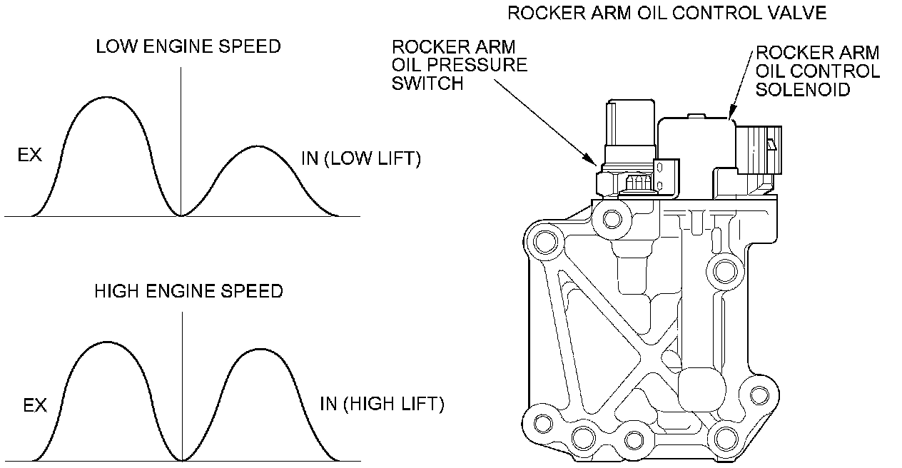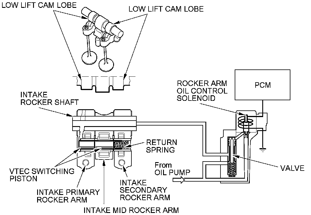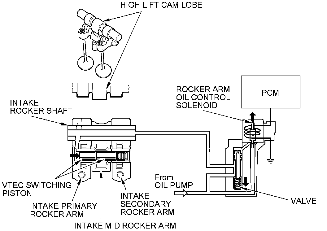 At high engine speed, the rocker arm oil control solenoid is turned on by the PCM. Oil pressure from the rocker arm control solenoid enters the primary intake rocker arm via the intake rocker shaft, and it moves the VTEC switching piston in the rocker arm.