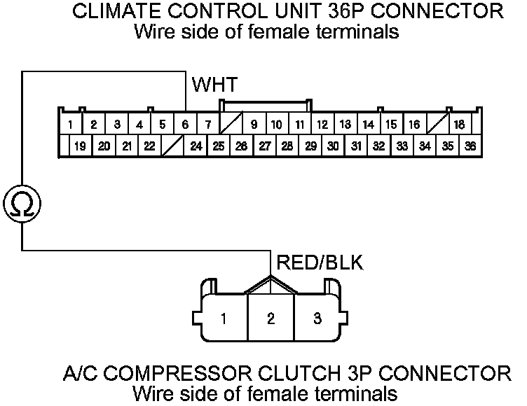 13. Check for continuity between the climate control unit 36P connector terminal No. 6 and the A/C compressor clutch 3P connector terminal No. 2.