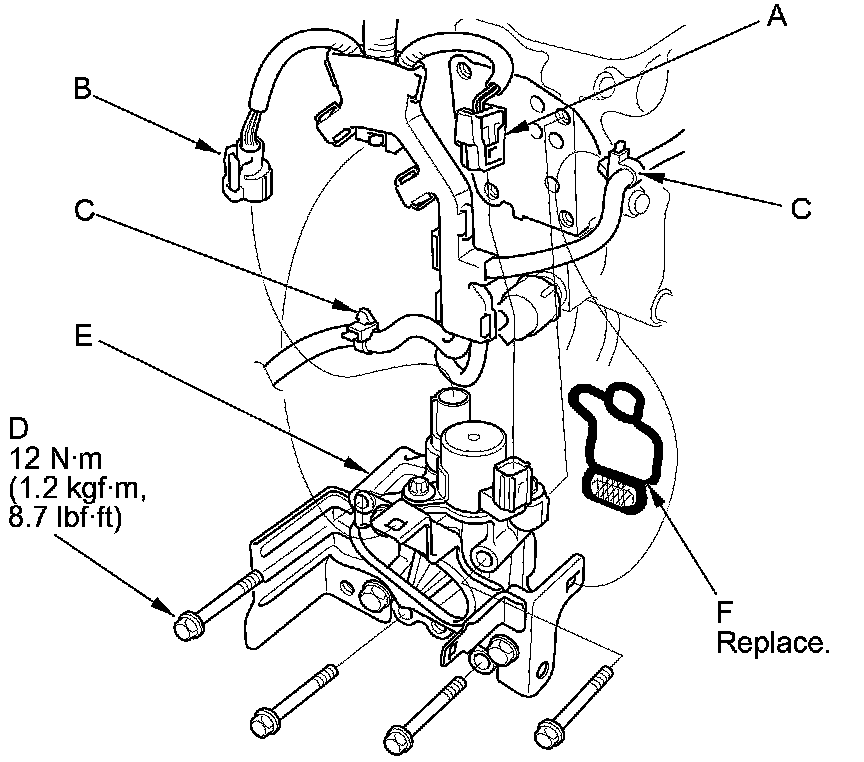 4. Remove the rocker arm oil control valve assembly (E) and the rocker arm oil control valve filter (F).