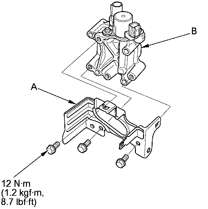 5. Remove the engine wire harness bracket (A) from the rocker arm oil control valve (B).