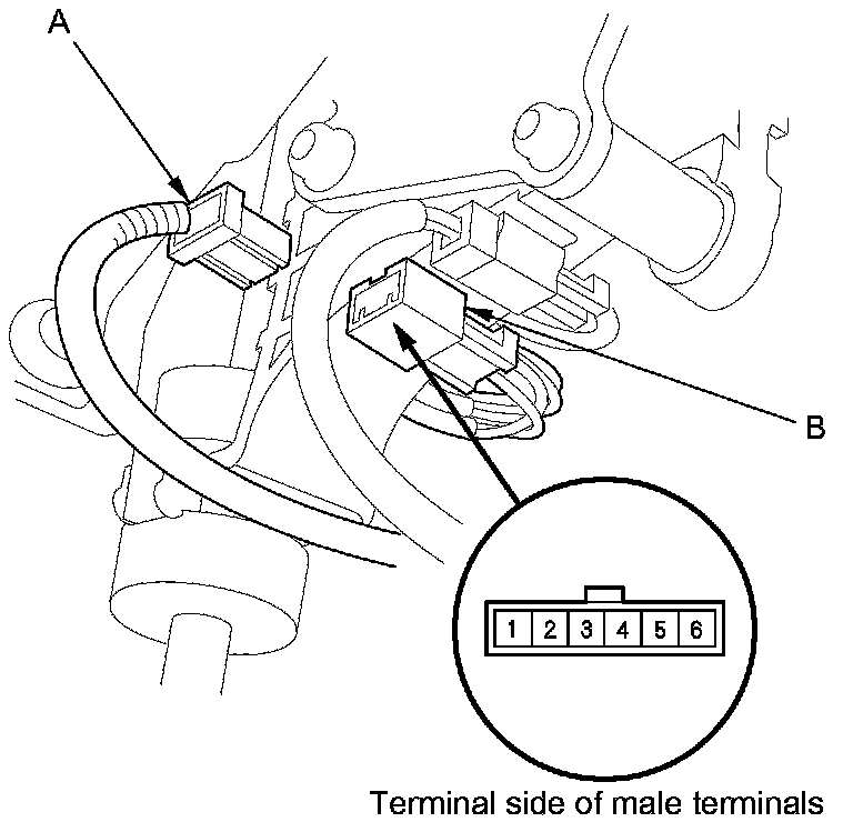 2. Disconnect A/T gear position indicator panel light/D3 switch/park pin switch 6P connector (A) from the park pin switch (B).