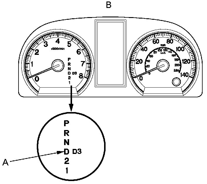 When the powertrain control module (PCM) senses an abnormality in the input or output system, the D indicator (A) in the gauge control module (B) will usually blink.