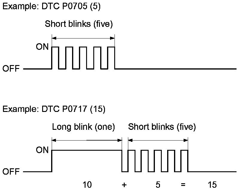 3. Select SCS mode, then observe the D indicator in the gauge control module. Codes 1 through 9 are indicated by individual short blinks. Code 10 and above are indicated by a series of long and short blinks. One long blink equals 10 short blinks. Add the long and short blinks together to determine the code.