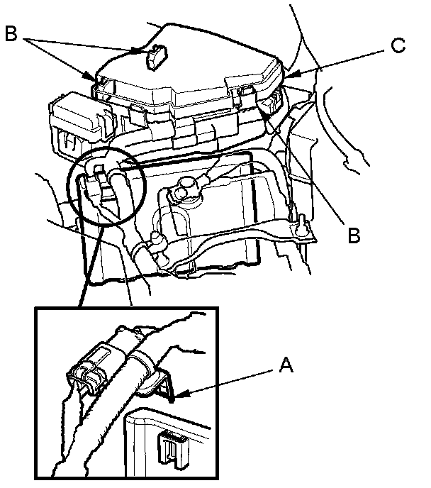 4. Release the three clips (B) securing the under-hood fuse/relay box (C), and lift up the box.