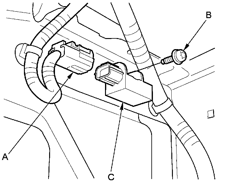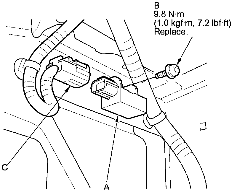 1. Install the front impact sensor (A) with a new TORX bolt (B) using a TORX T30 bit, then connect the engine compartment wire harness 2P connector (C) to the front impact sensor.