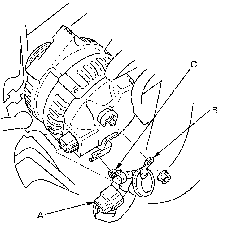 1. Connector the alternator connector (A), BLK wire (B), and harness clamp (C) to the alternator.