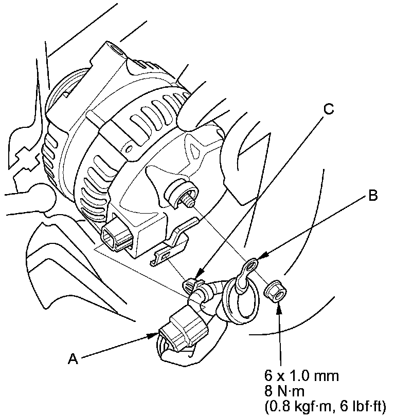 5. Disconnect the alternator connector (A), BLK wire (B), and harness clamp (C) from the alternator, then remove the alternator.