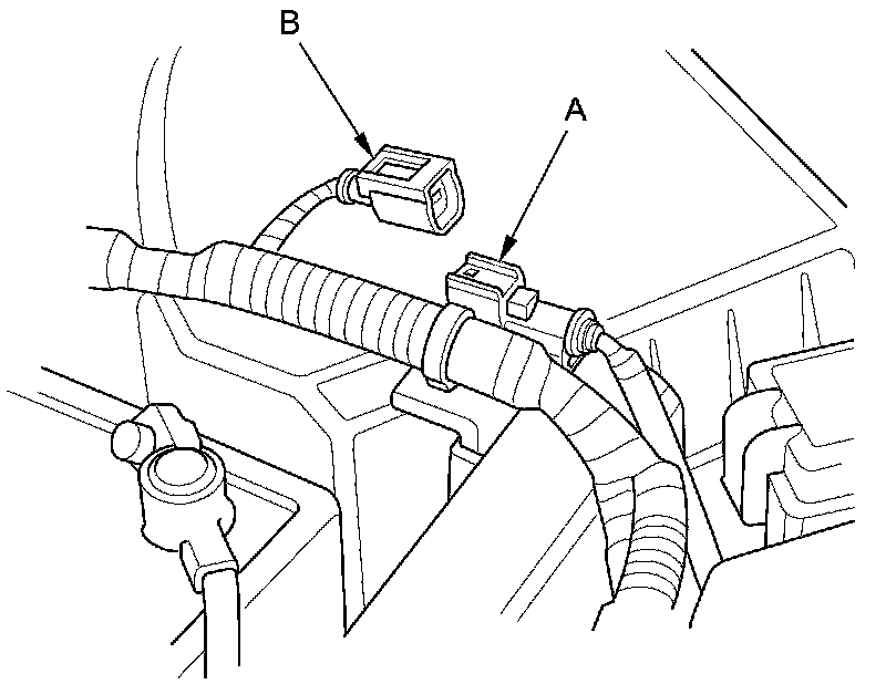 10. Make sure the shift lever is in P or N, then disconnect the starter subharness 1P connector (A) from the left engine compartment wire harness 1P connector (B). Connect a jumper wire from the battery positive terminal to the starter subharness 1P connector.