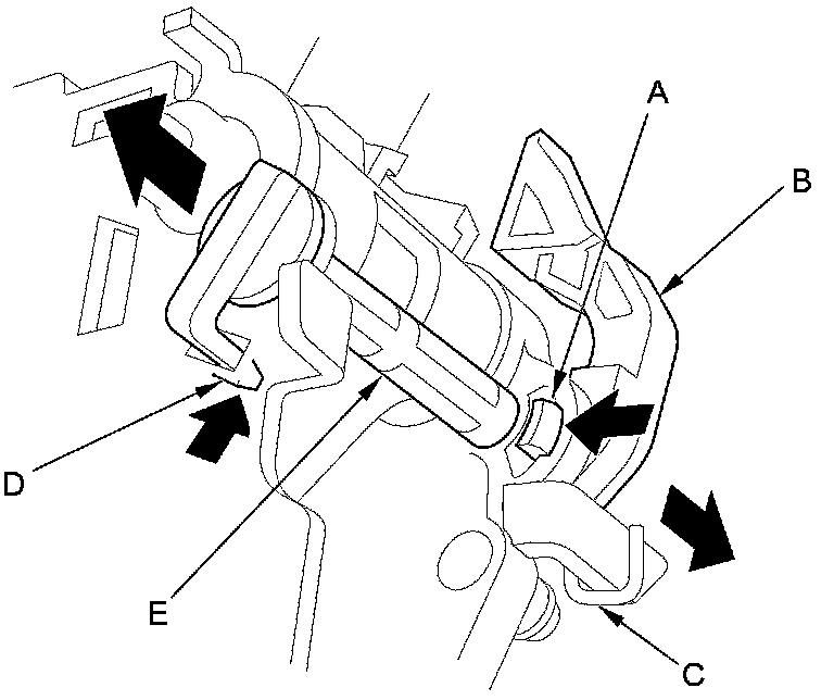 4. Release the lock (D) of the shift lock release shaft (E), and remove the shaft.