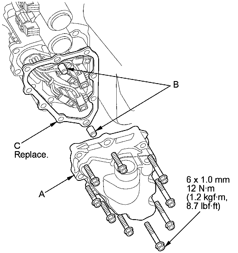 13. Remove the shift solenoid valve cover (A), the dowel pins (B), and the gasket (C).