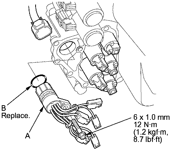 15. Install a new O-ring (B) on the shift solenoid wire harness connector, then install the connector in the transmission housing.