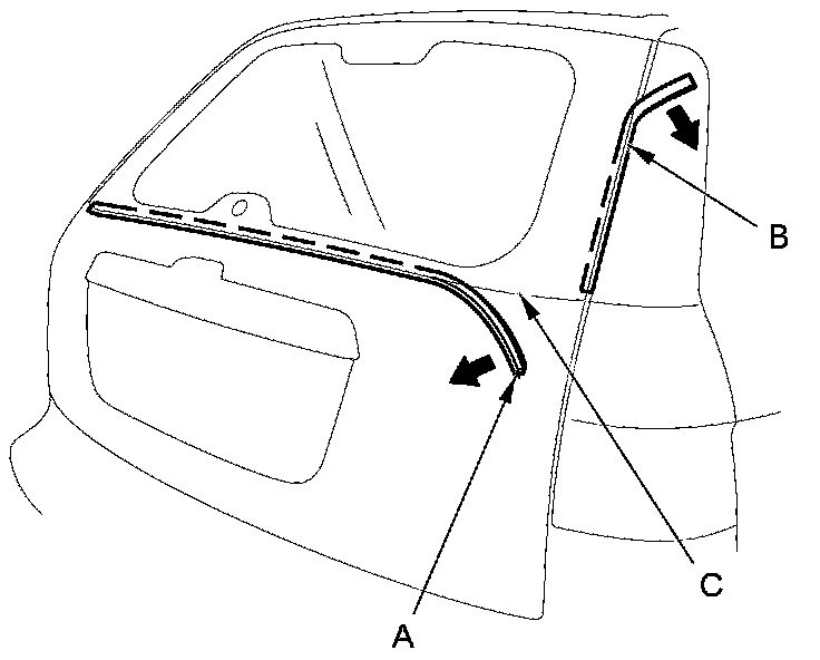 2. Remove the lower rubber dam (A) and the side rubber dams (B) from the edges of the rear window (C). If necessary, cut the rubber dams with a utility knife.