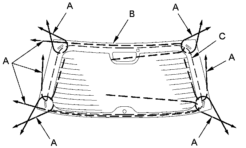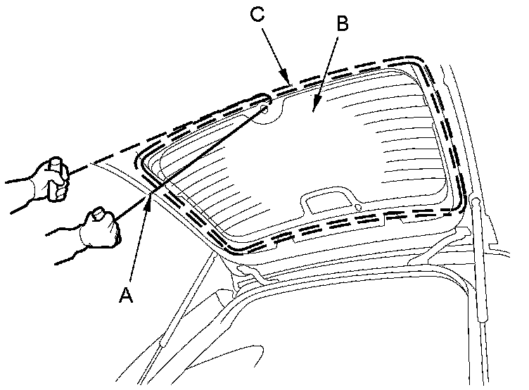 6. With a helper on the outside, pull the piano wire (A) back and forth in a sawing motion. Hold the piano wire as close to the rear window (B) as possible to prevent damage to the tailgate, and carefully cut through the adhesive (C) around the entire rear window.