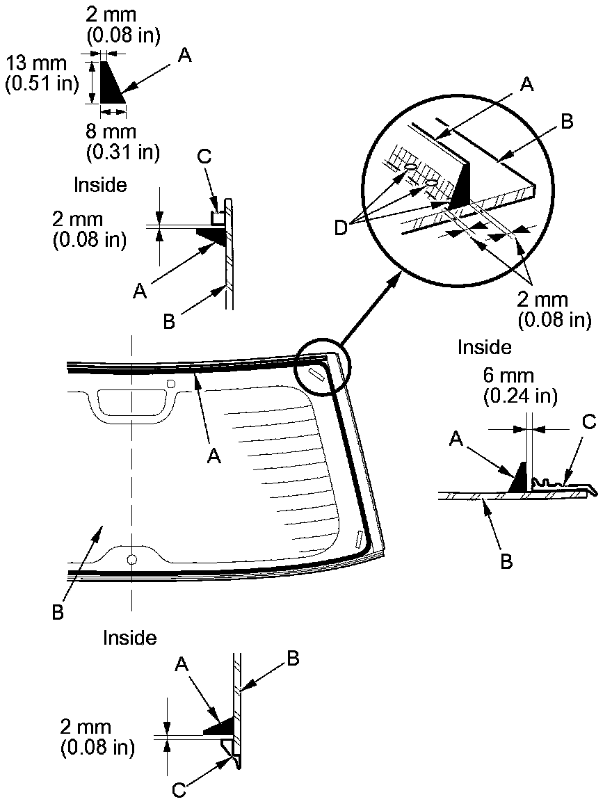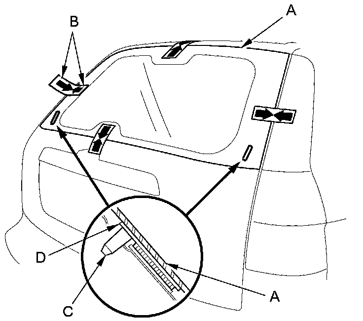 14. If you are installing a new rear window, set the rear window (A) in the opening, and center it. Make alignment marks (B) across the rear window and the body with a grease pencil at the four points shown. Make sure the pins (C) of both clips (D) contact with the holes of the tailgate corner. Be careful not to touch the rear window where the adhesive will be applied.