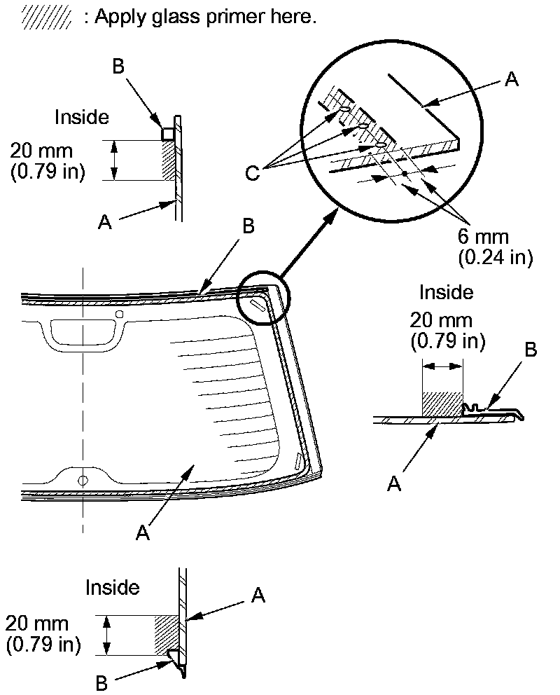 - Apply the glass primer to the corner portions of the rear window using the printed dots (C) on the rear window as a guide.