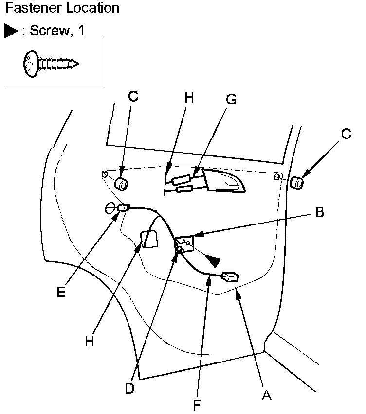 3. Disconnect the power door lock actuator connector (E), and pass the harness (F) and the cables (G) through the holes (H) in the plastic cover.