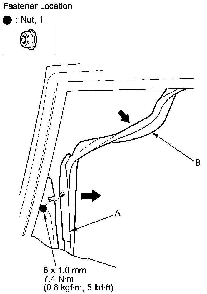 5. Remove the nut from the rear lower channel (A). Pull the glass run channel (B) away as needed. Pull the rear lower channel forward from the door.