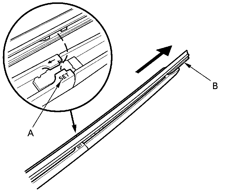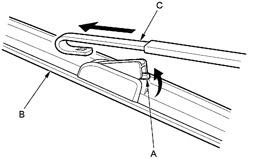 2. Pull up and hold the tab (A), and slide the wiper blade (B) toward the tabs until it releases from the wiper arm (C).