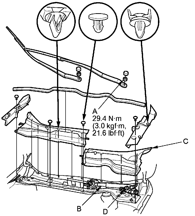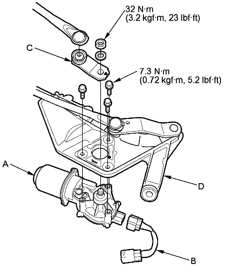2. Install the wiper motor (A), windshield wiper motor subharness (B) and link (C) to the wiper linkage assembly (D).