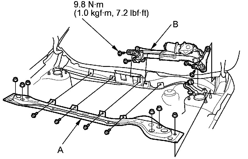 1. Open the hood. Remove the caps, nuts (A), and the windshield wiper arms (B).