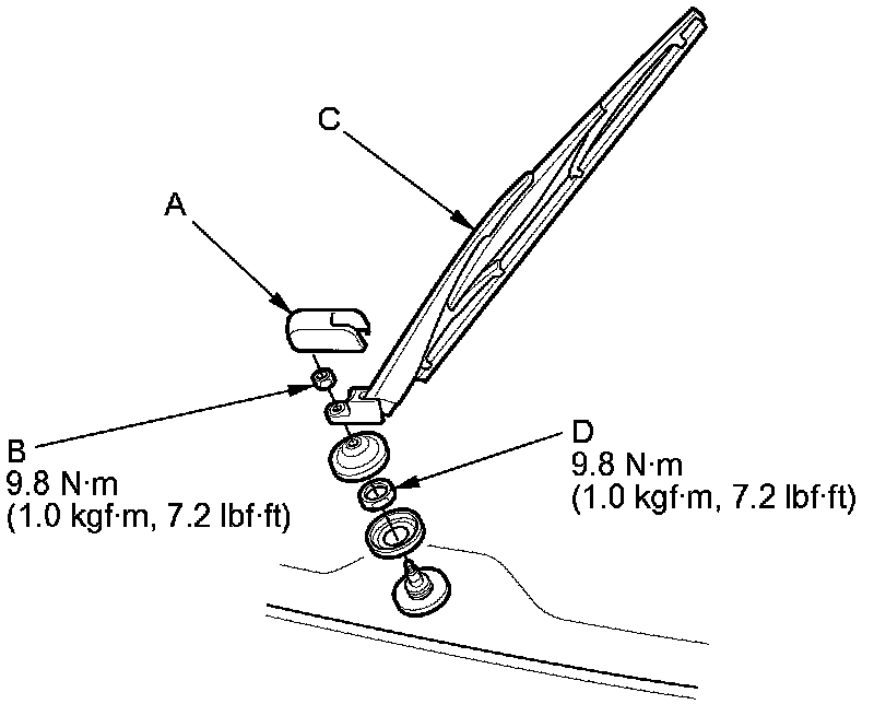 1. Remove the cap (A), mounting nut (B), wiper arm (C), and special nut (D).