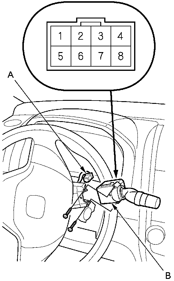 2. Disconnect the 8P connector (A) from the wiper/washer switch (B).