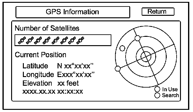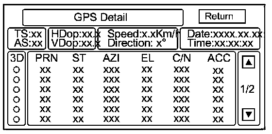 By pressing and holding the MENU button for 2 seconds, a GPS Detail screen appears. This screen displays real time incoming satellite positional data when the vehicle is outside in the open. The information shown on this screen is for factory use.
