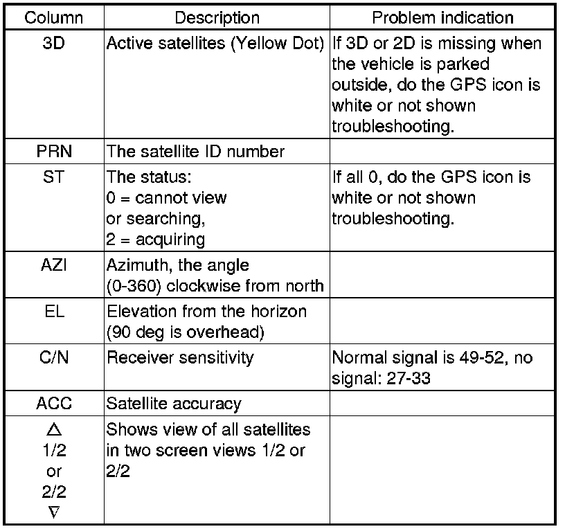 - If the row of data in the table below begins with a yellow dot, the AZI and EL fields can be used to locate each satellite on the circular GPS diagram (see prior screen).