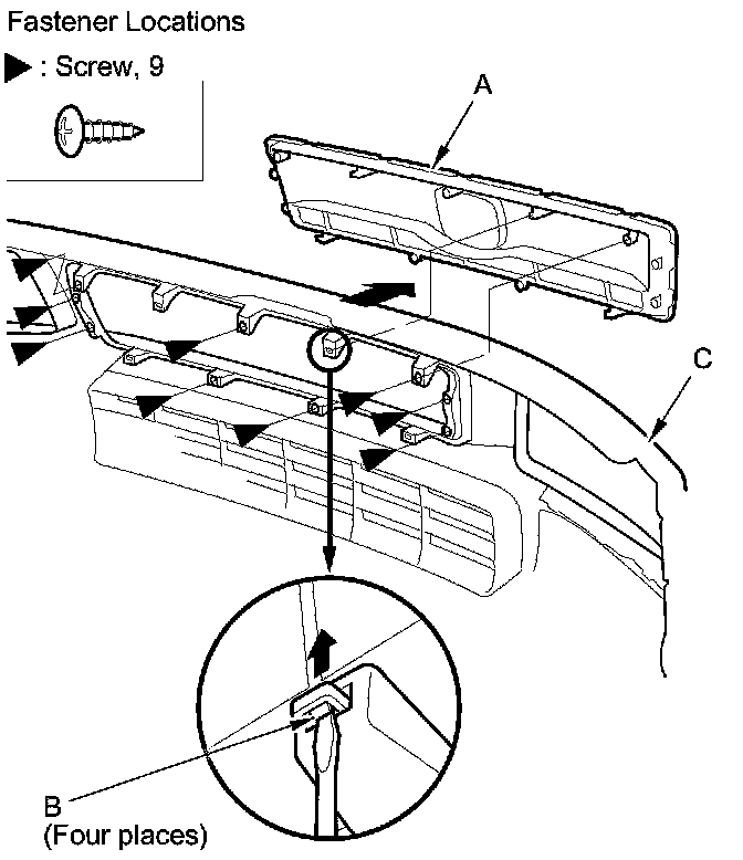 2. Separate the front emblem (A) from the front grille molding (B) by removing the push nuts (C).