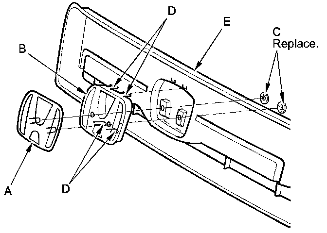 3. If necessary, separate the front emblem (A) from the emblem base (B) by removing the push nuts (C), and release the hooks (D), then remove the front emblem base from the front grille (E).
