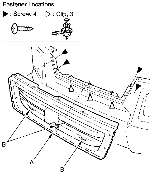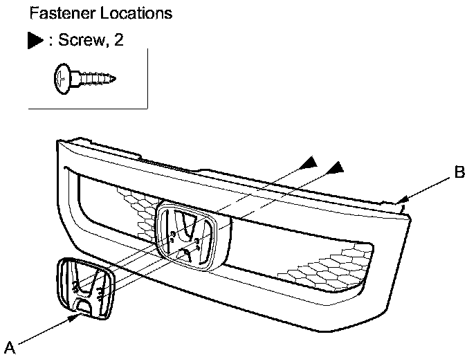 2. Remove the screws, then remove the front emblem (A) from the front grille (B).
