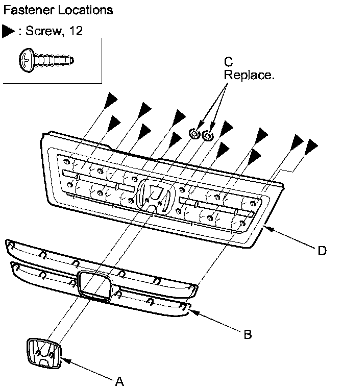 3. Remove the screws, and remove the front grille molding from the front grille base (D).