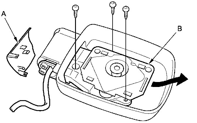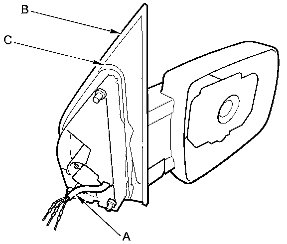 6. Remove the three screws (A), and separate the mirror housing (B) from the bracket (C).