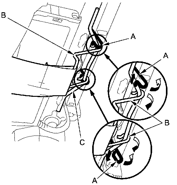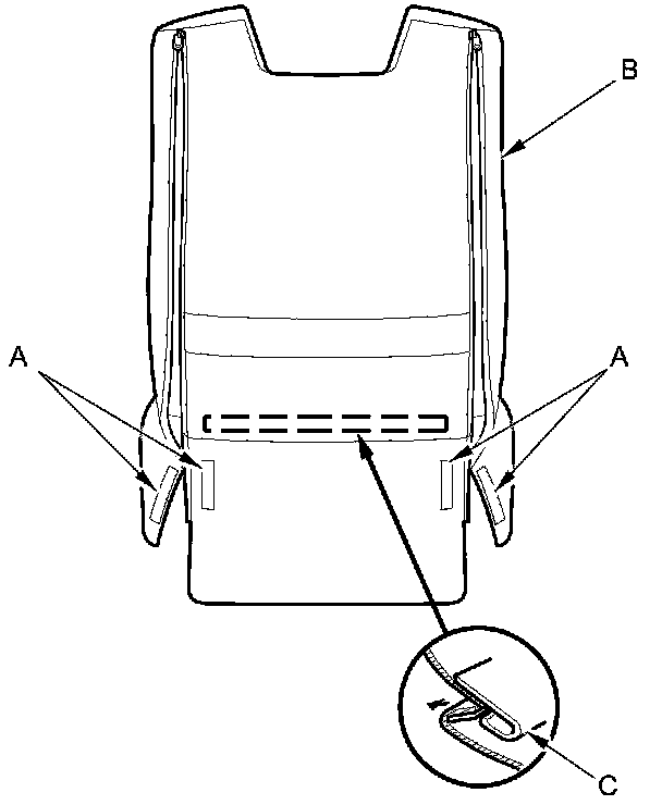 10. Release airbag attachment wire A and airbag attachment wire B from the seat-back frame (C).