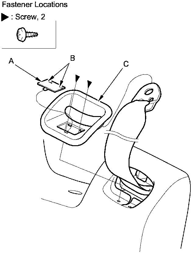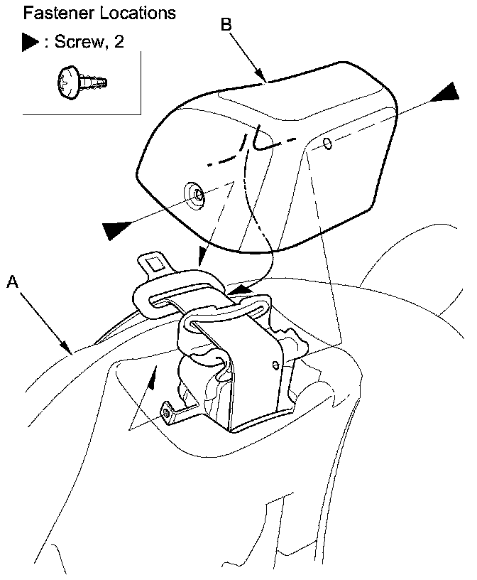 9. Pry out on the front seat belt trim cap (A) with the appropriate trim tool to release the hooks (B), then remove the screws securing the shoulder front seat belt trim (C).