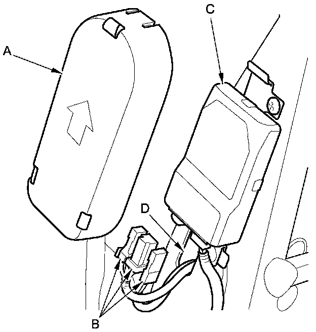 11. Passenger's seat: Remove the ODS unit cover (A), and disconnect the OPDS sensor connectors (B) from the ODS unit (C), and pull them in through the hole (D) in the seat frame.