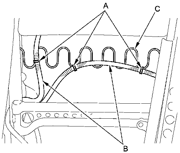 12. Passenger's seat: Release the wire ties (A) fastening the OPDS sensor harnesses (B) to the seat-back frame spring (C).
