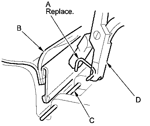 - Replace all of the upholstery rings (A) fastening the seat-back cover (B) and the pad wire (C) with new ones using commercially available upholstery ring pliers (D).