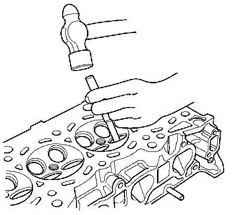 5. Working from the camshaft side, use the driver and an air hammer to drive the guide about 2 mm (0.08 in) towards the combustion chamber. This will knock off some of the carbon and make removal easier. Hold the air hammer directly in line with the valve guide to prevent damaging the driver. Wear safety goggles or a face shield.