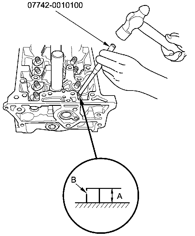 9. Apply a thin coat of new engine oil to the outside of the new valve guide. Install the guide from the camshaft side of the head, use the valve guide driver to drive the guide into the specified installed height (A) of the guide (B). If you have all 16 guides to do, you may have to reheat the head.