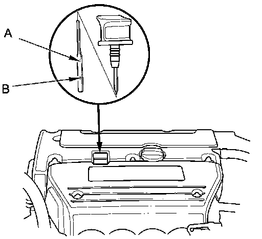 3. Remove the dipstick, and check the engine oil level. It should be between the upper mark (A) and the lower mark (B).