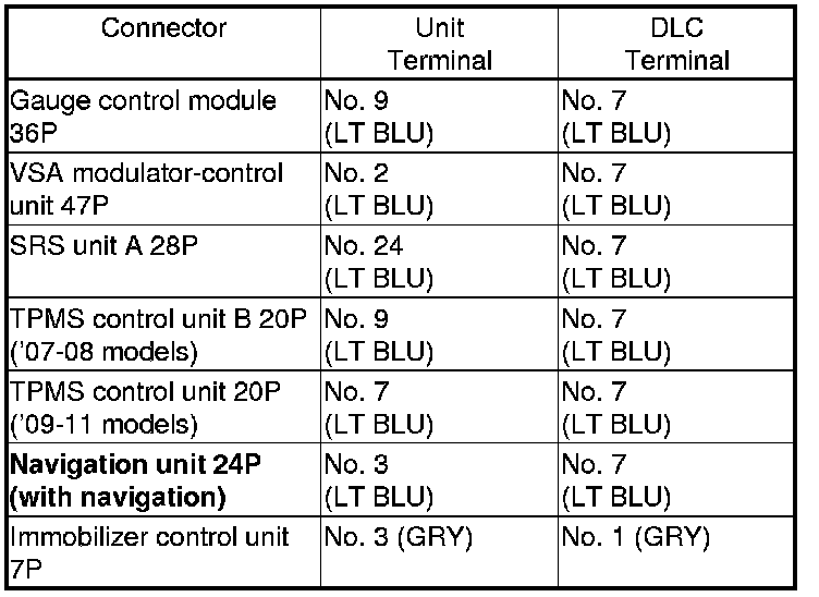 Repair short in the wire between DLC No. 7 (K-line) and the VSA modulator-control unit, the SRS unit, the navigation unit (with navigation), the TPMS control unit, the gauge control module, or DLC No. 1 (DIAG-H line) and the immobilizer control unit.�