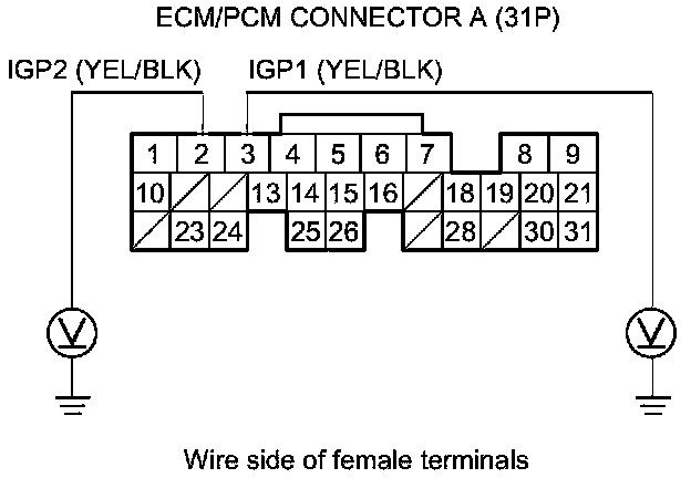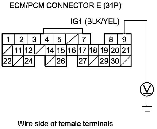 70. Measure the voltage between body ground and ECM/PCM connector terminals A4, A5, A8, A9, and E3 individually.