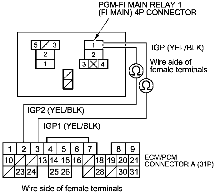 69. Check for continuity between PGM-FI main relay 1 (FI MAIN) 4P connector terminal No. 1 and ECM/PCM connector terminals A2 and A3 individually.