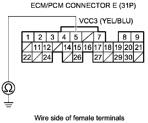 30. Check for continuity between ECM/PCM connector terminal E11 and DLC terminal No. 6.